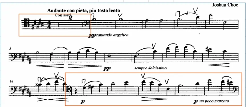 今回のもう一つの難関は、「ハイポジション」 の音です。(上の楽譜の3段目です)